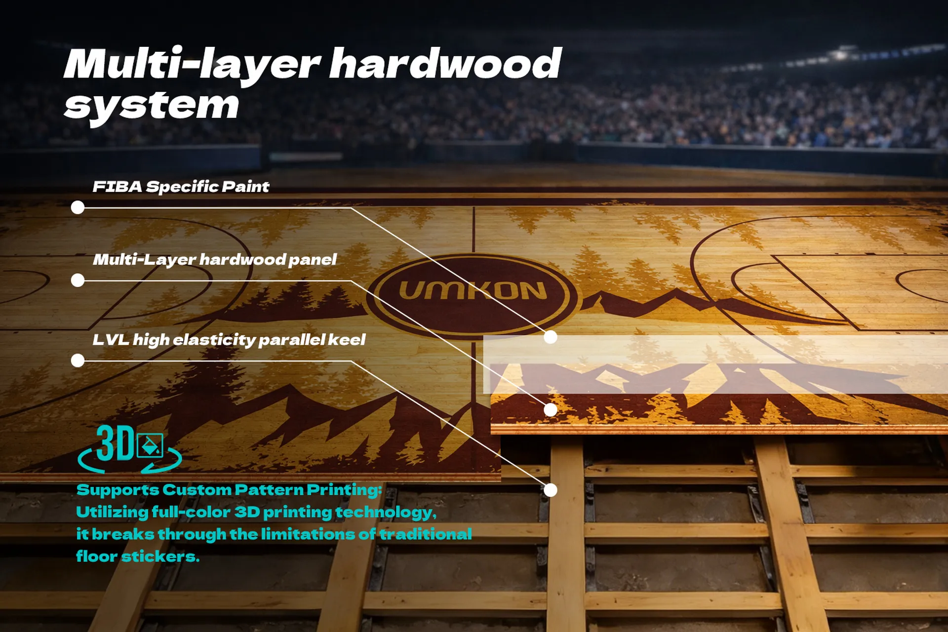 COPOSPORT’s Multi-Layer Hardwood System is a high-performance sports flooring solution designed for safe, consistent play in professional arenas, schools, and multi-purpose halls. Its resilient construction enhances shock absorption, dispersing impact forces to help reduce stress on joints and muscles—supporting comfort and safety during intense training and competition.